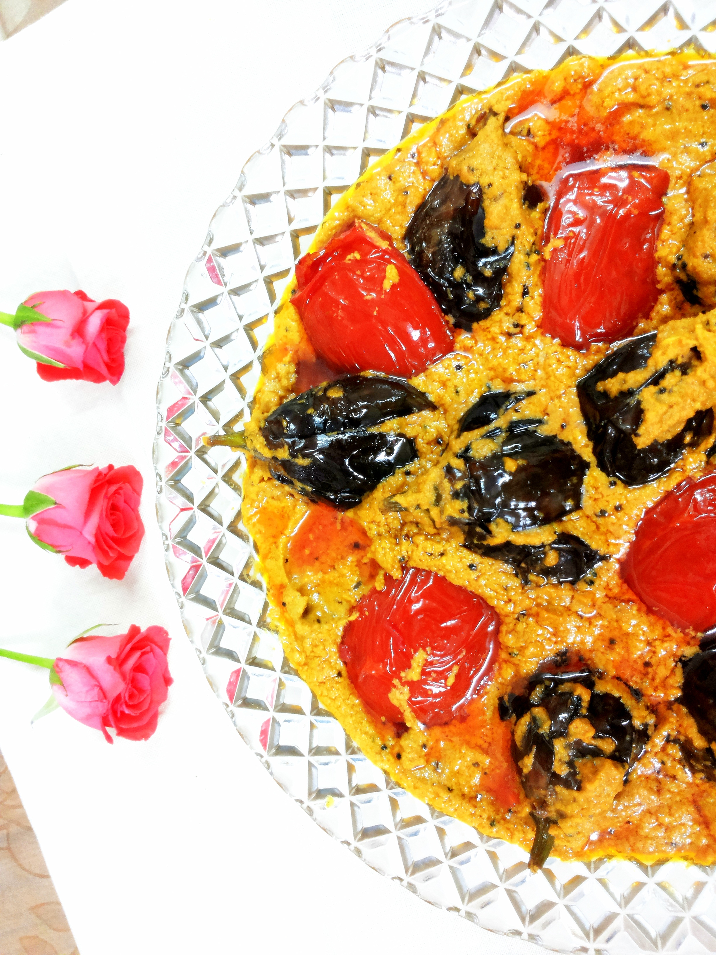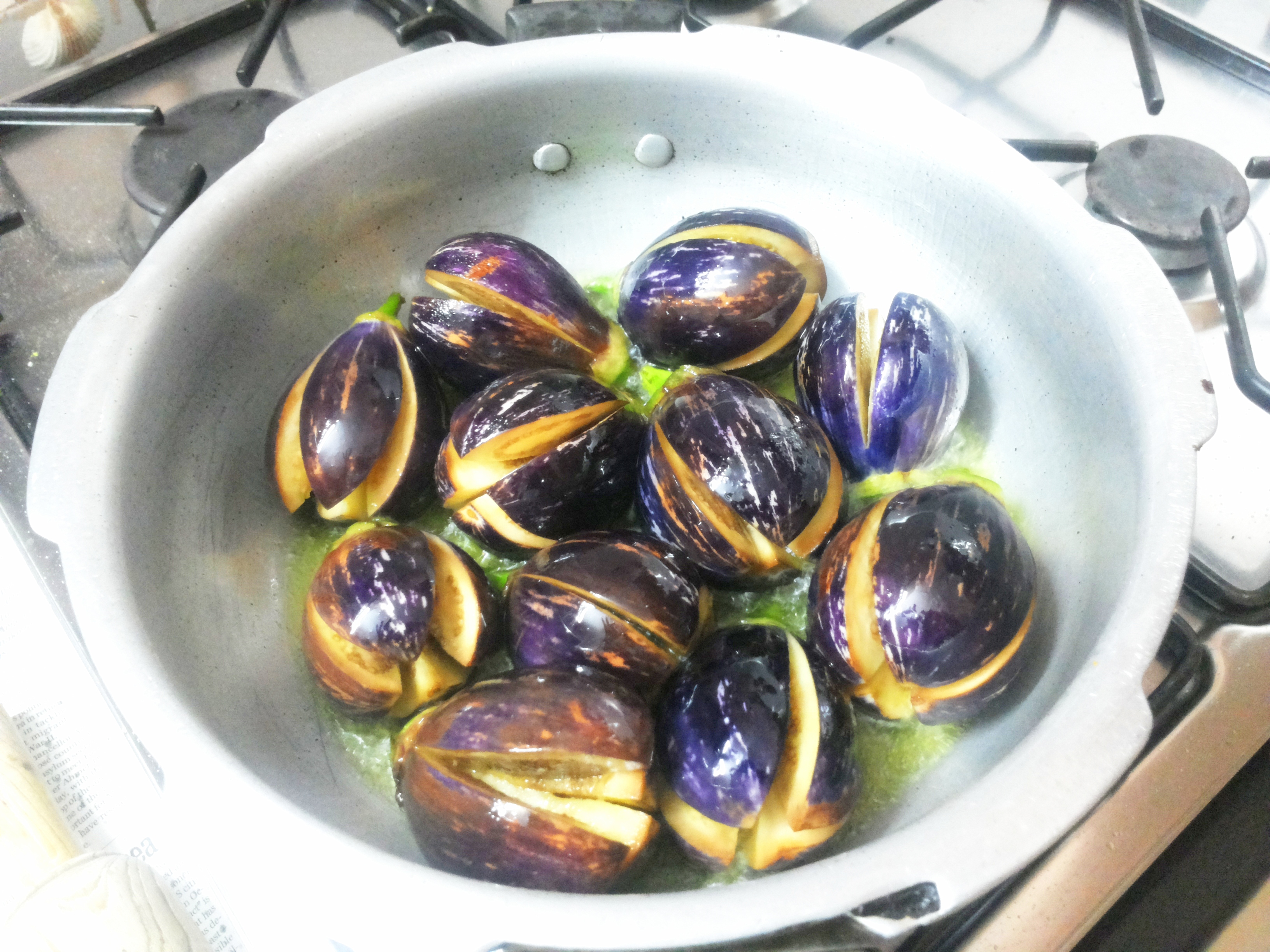 Tomatoes and tamarind pulp are sparingly used to give it that tangy taste. The taste and texture of this small egg plant recipe is completely thrilling due to nutty taste of peanut, sesame seed, and very different from the big egg plant preparation.