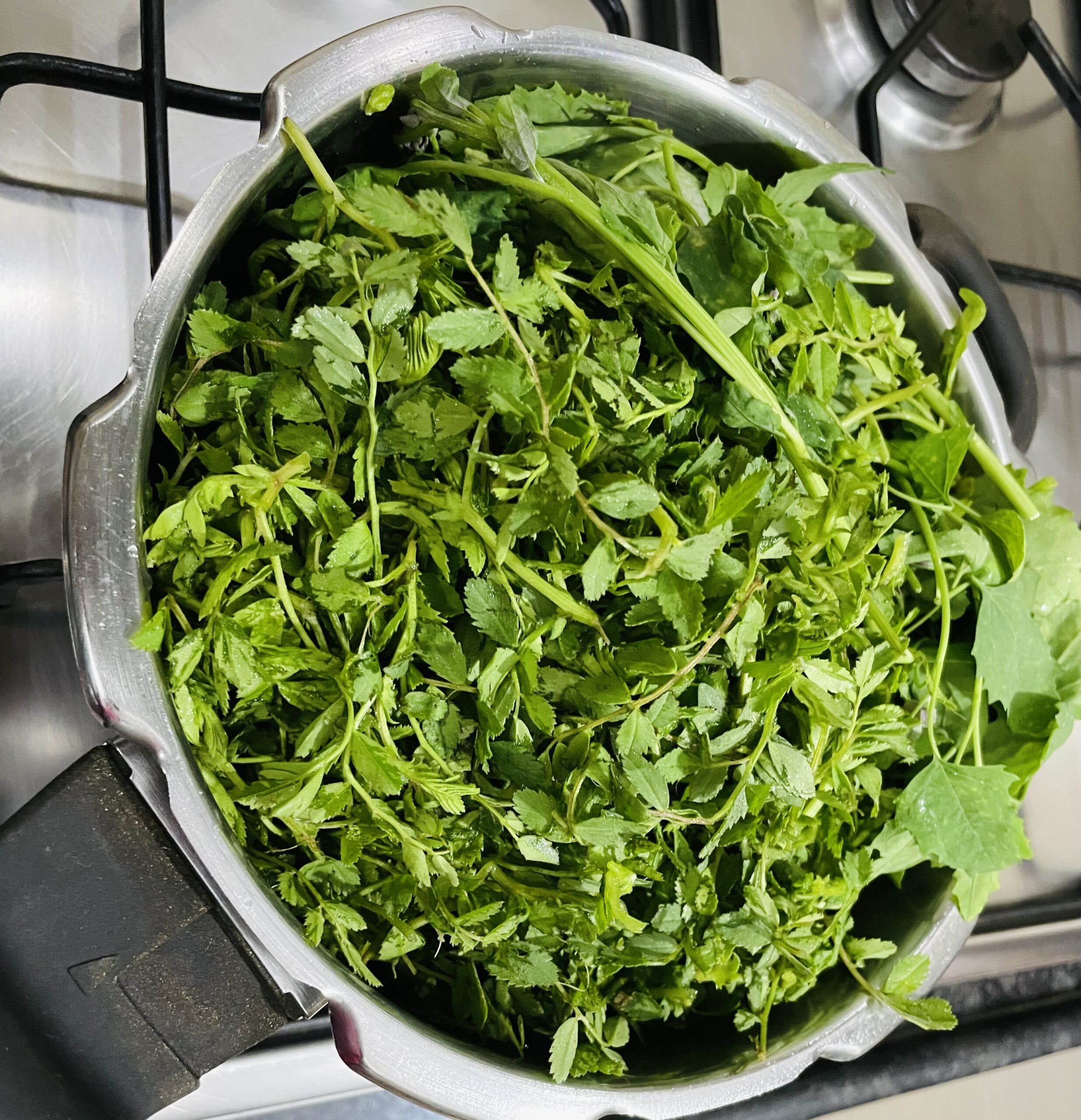 1. Take cooker; put chana leaf, bathua/spinach, ginger paste, asafoetida and salt with a cup of water.