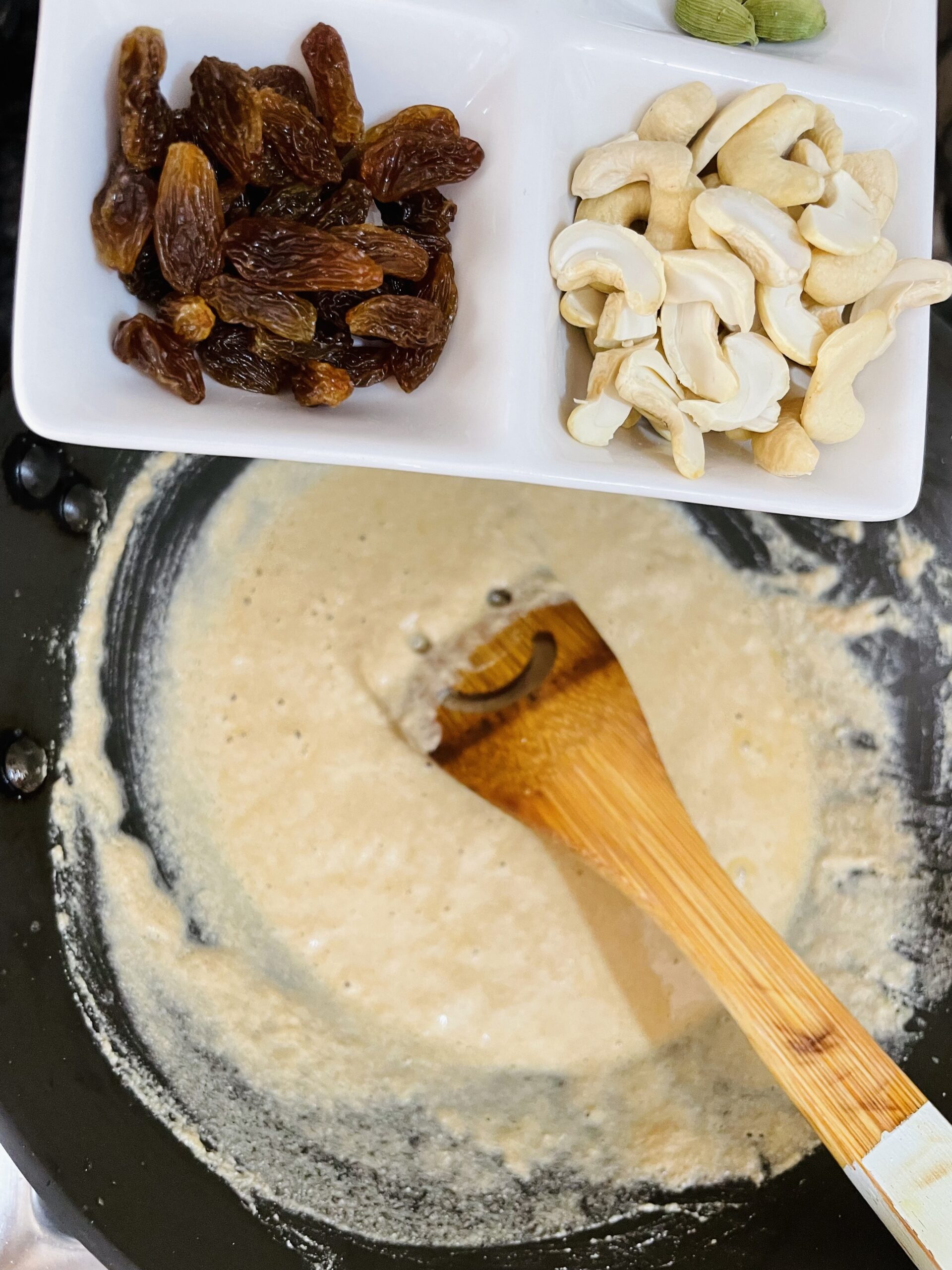2. Add cashew nut; continue to fry for couple of minutes; add raisin, continue to fry for a minute.