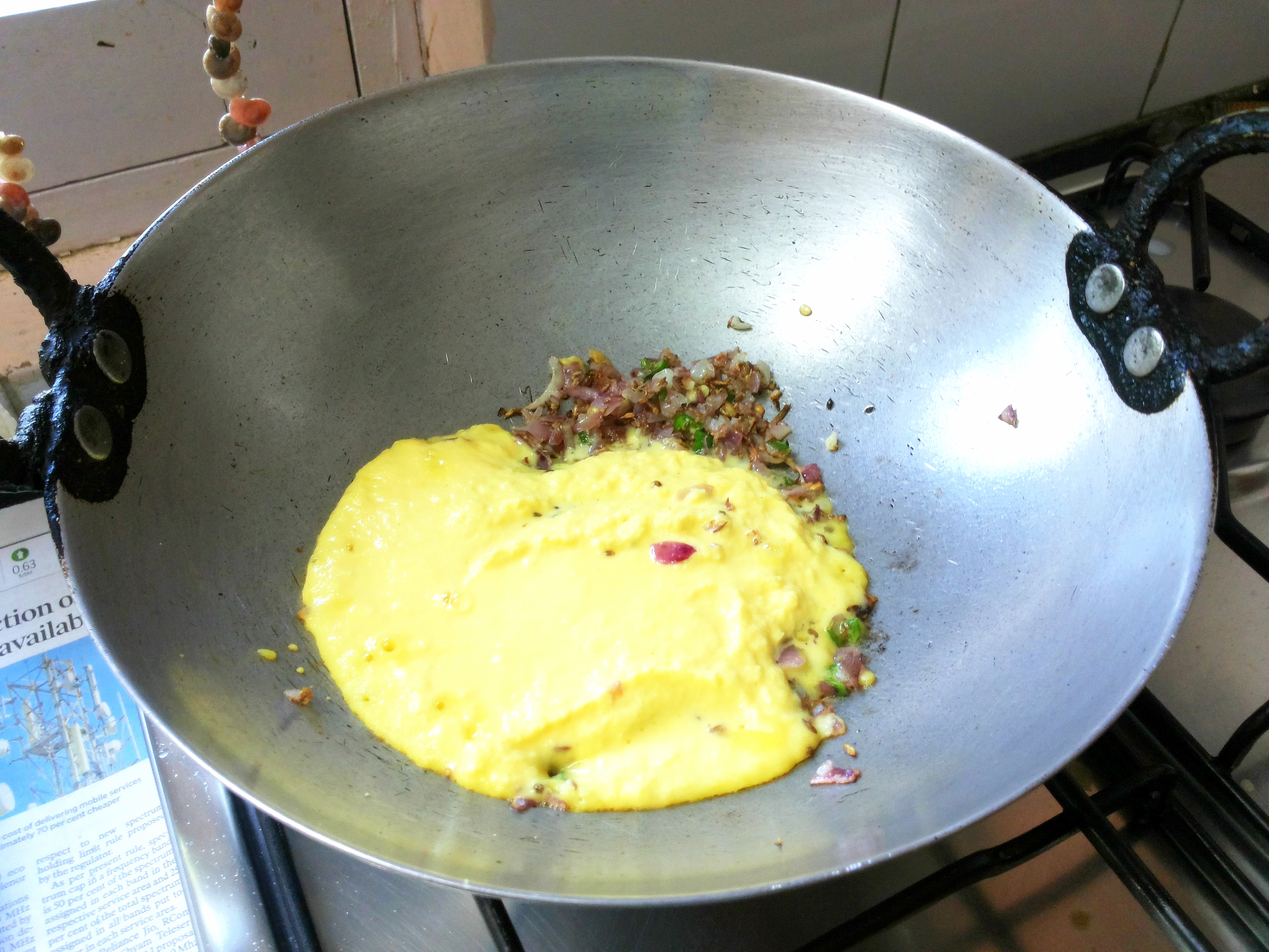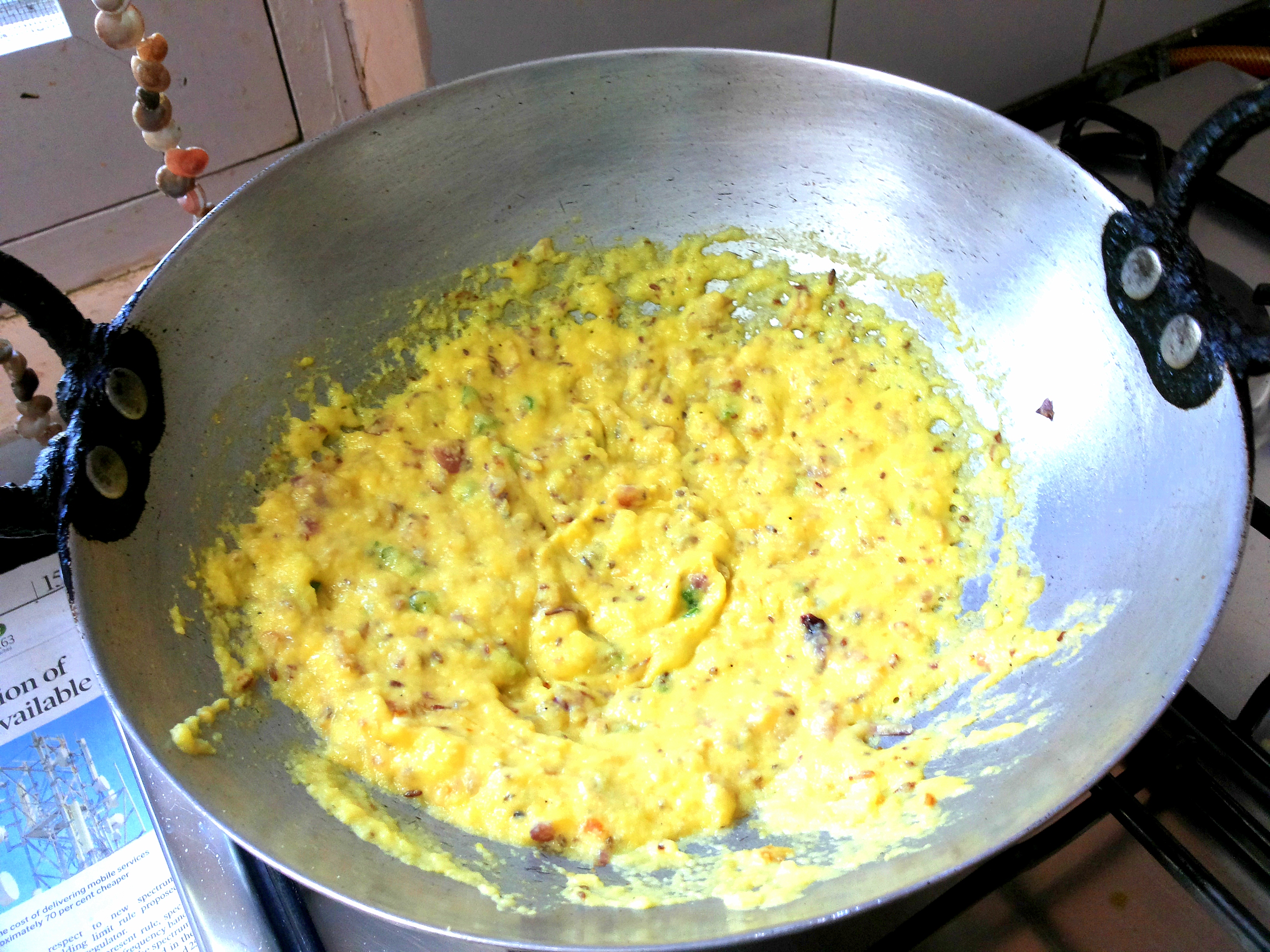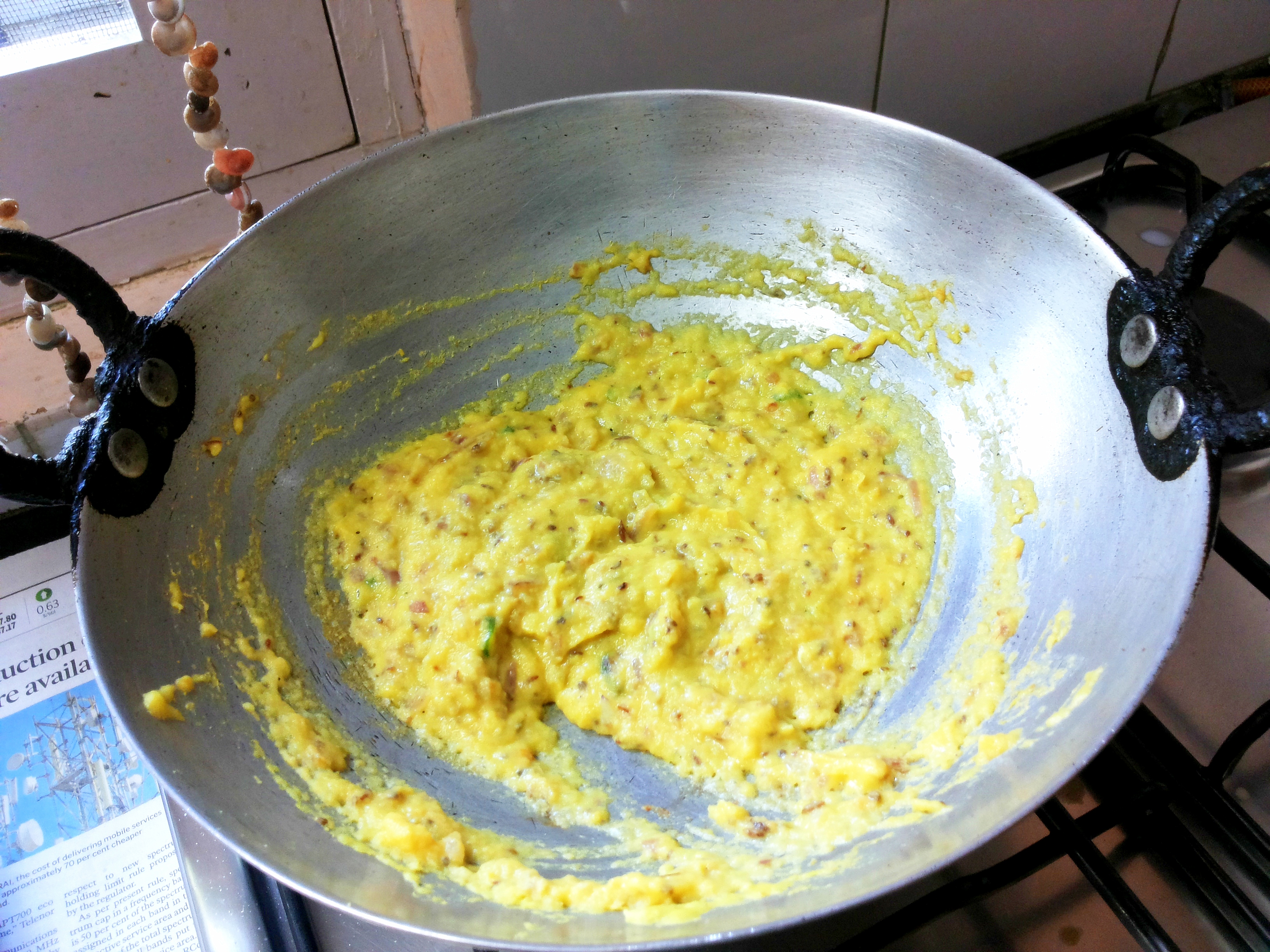 4. Add ajwain and ground sweet corn paste, fry for couple of minutes on medium flame.