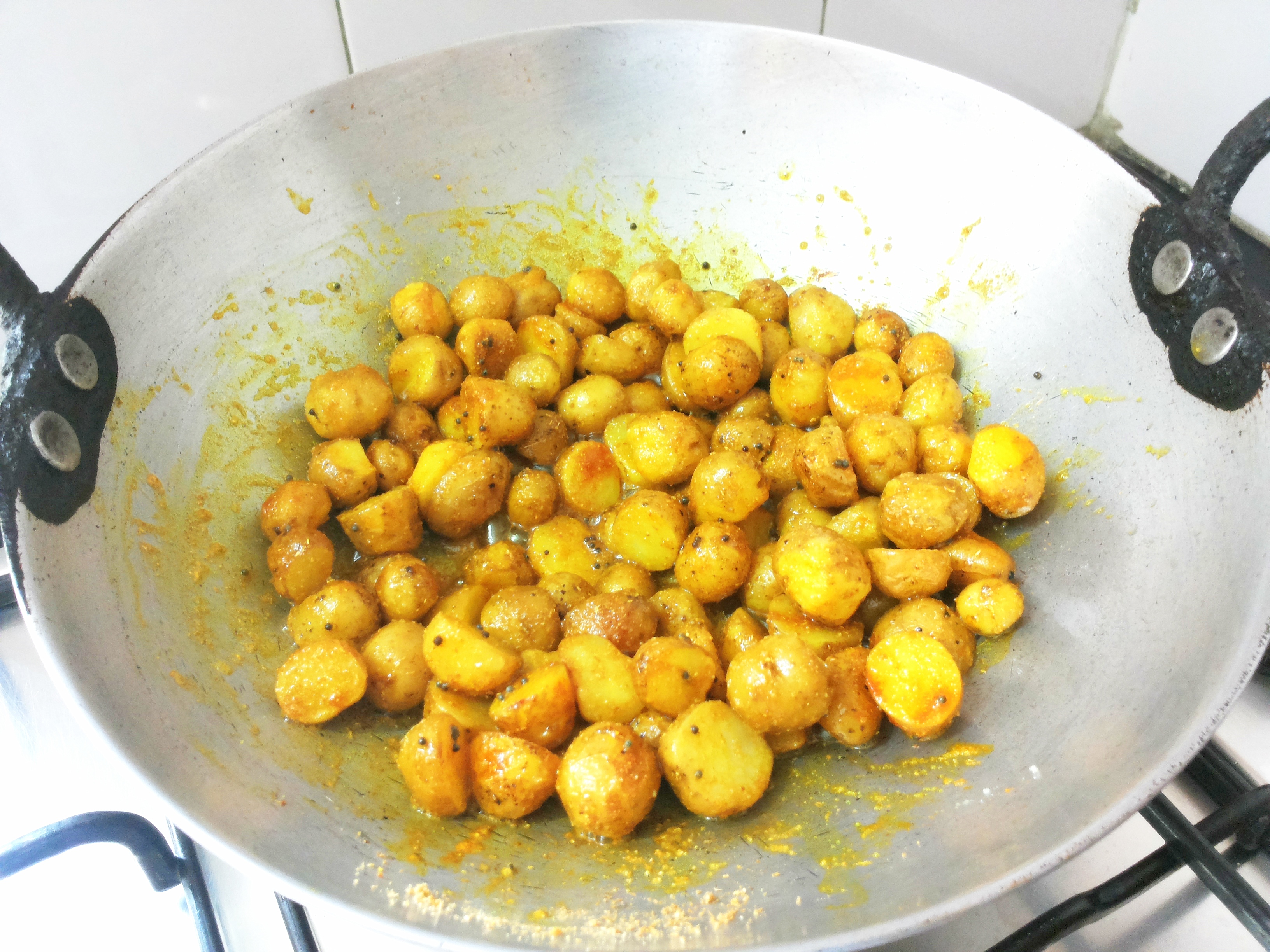 - Add baby potatoes in the oil, saute on low flame, cover it; fry until half done, (About 5-7 minutes), add coriander powder, turmeric powder and salt.