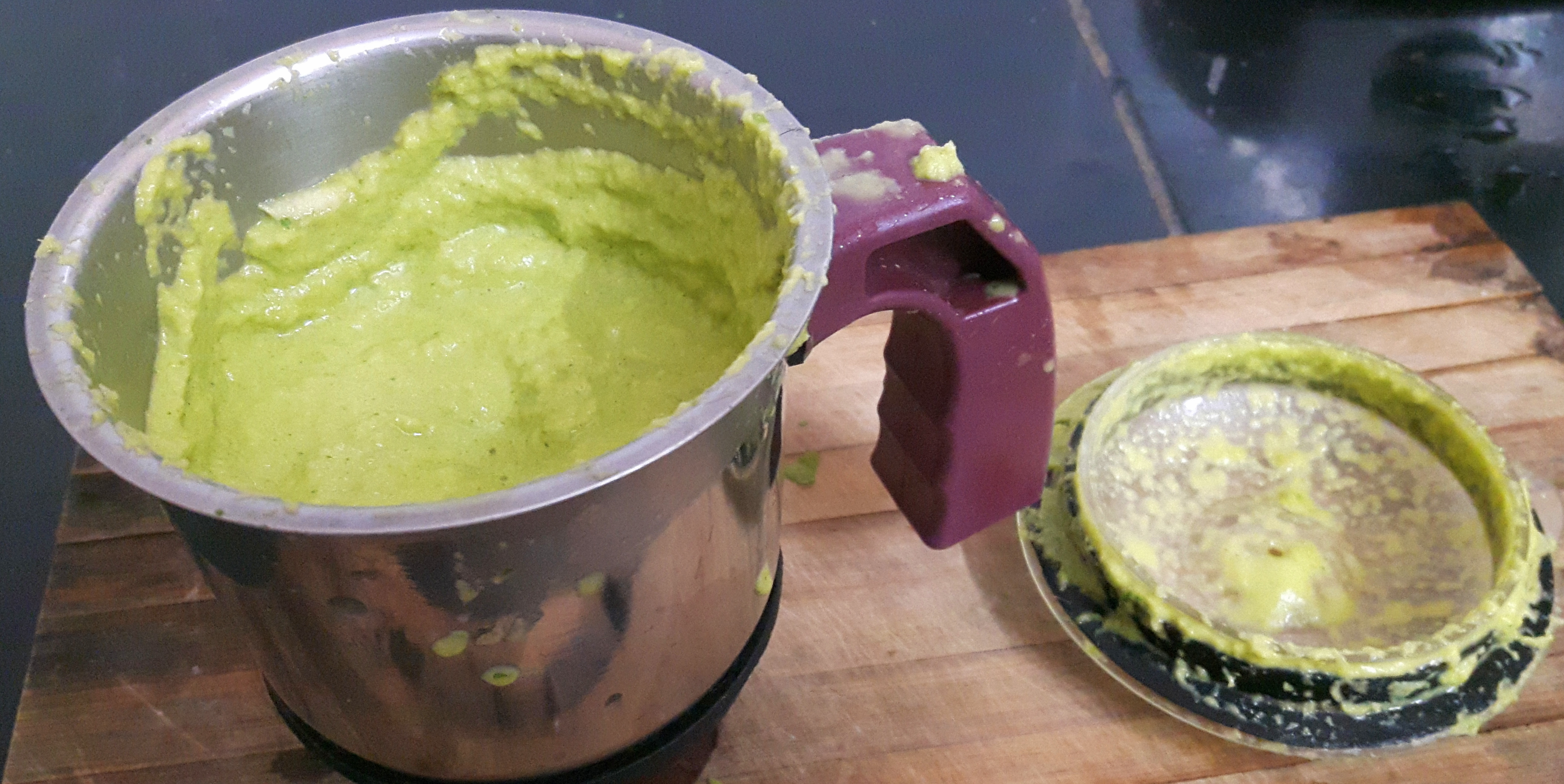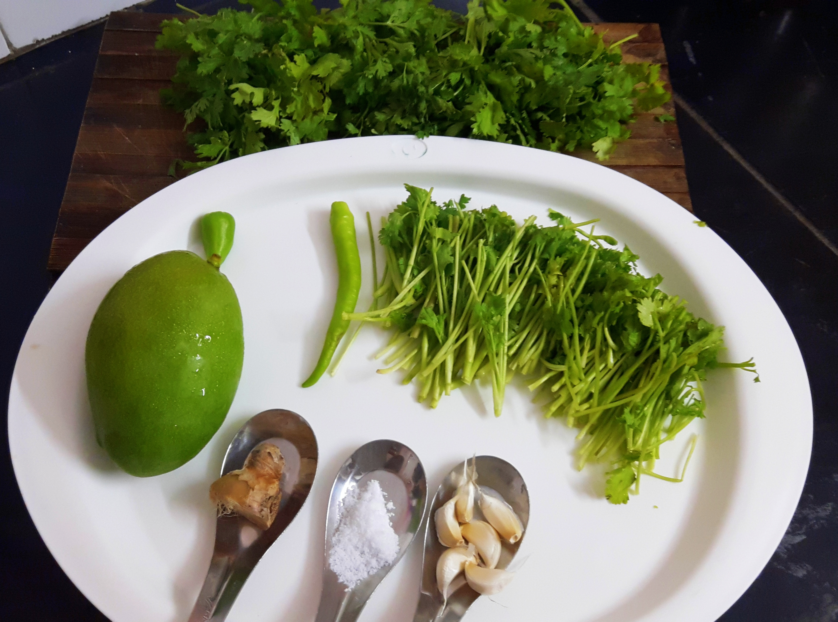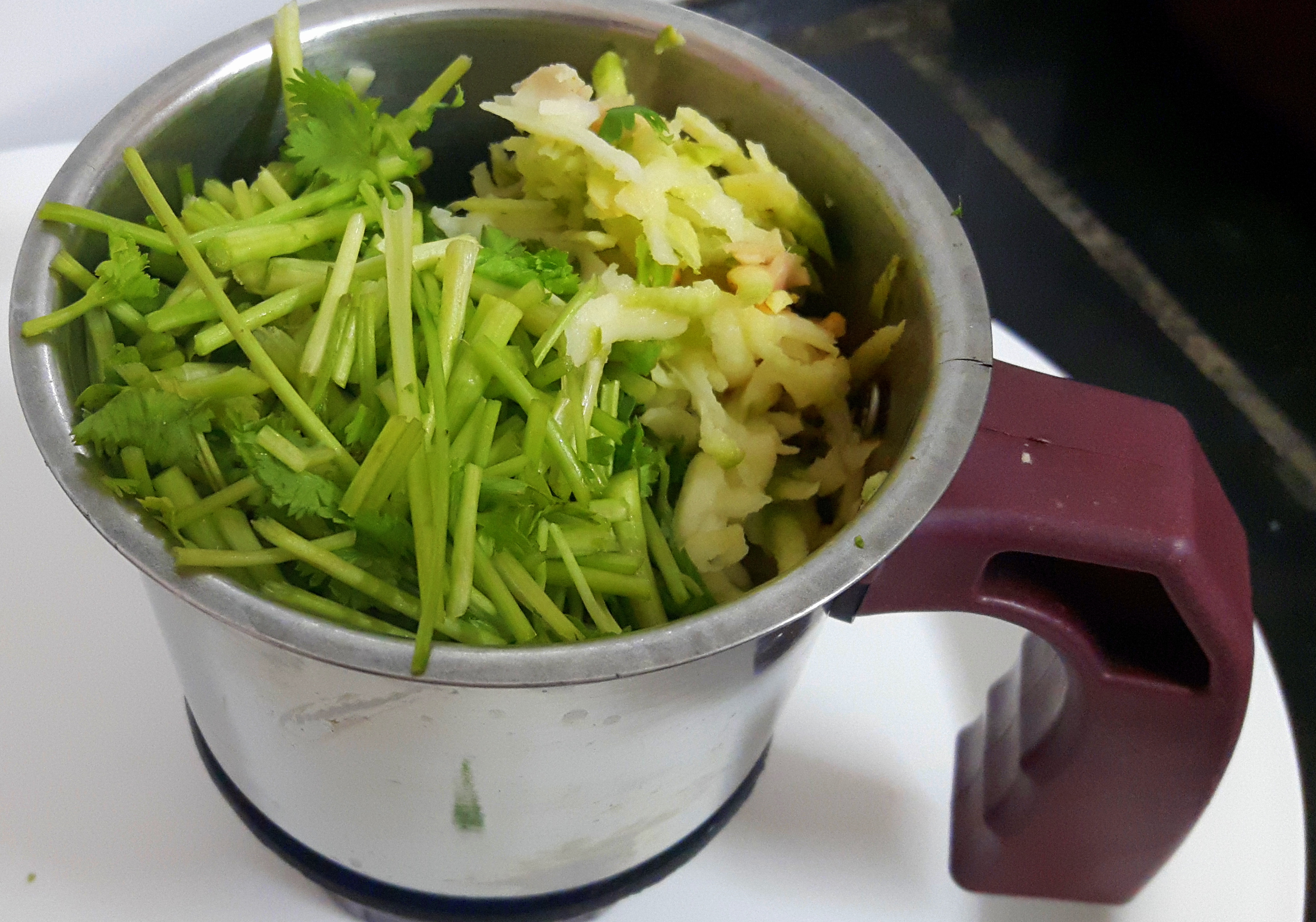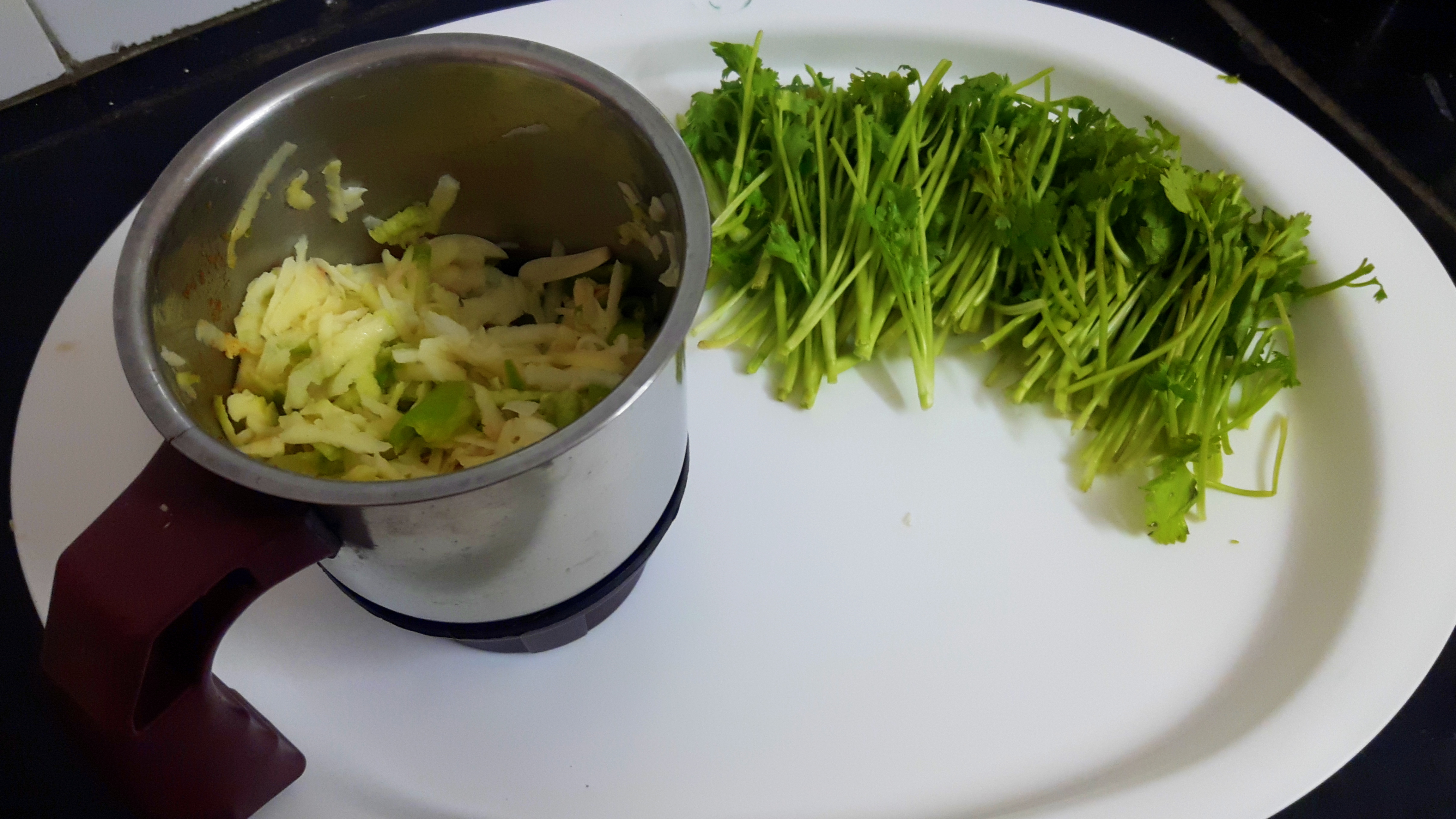 1. Chop coriander stem, green chilli, into small pieces, keep aside.