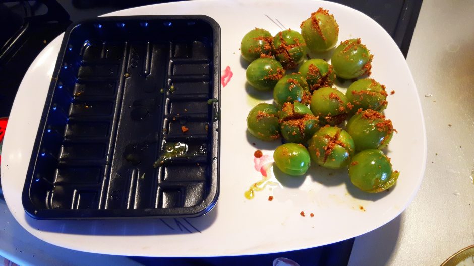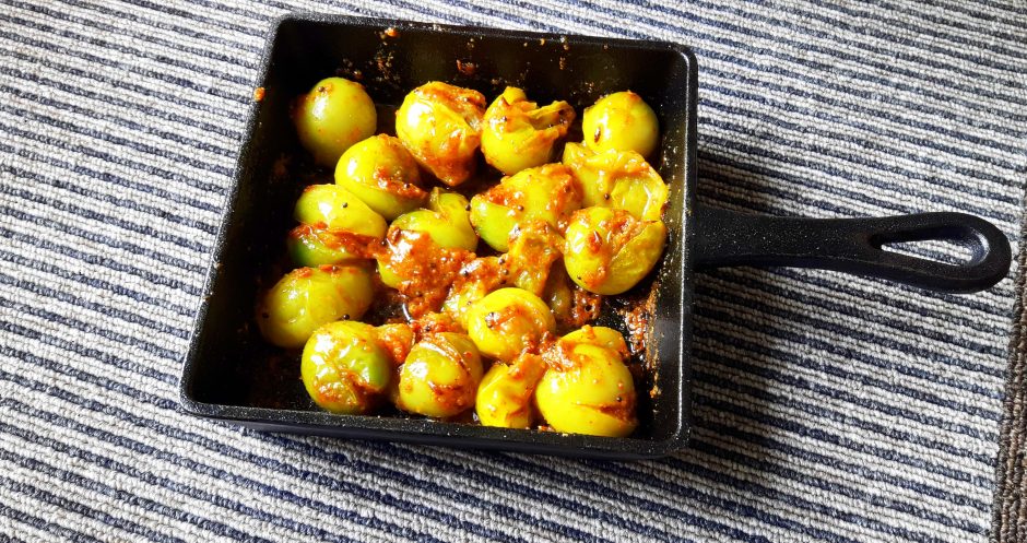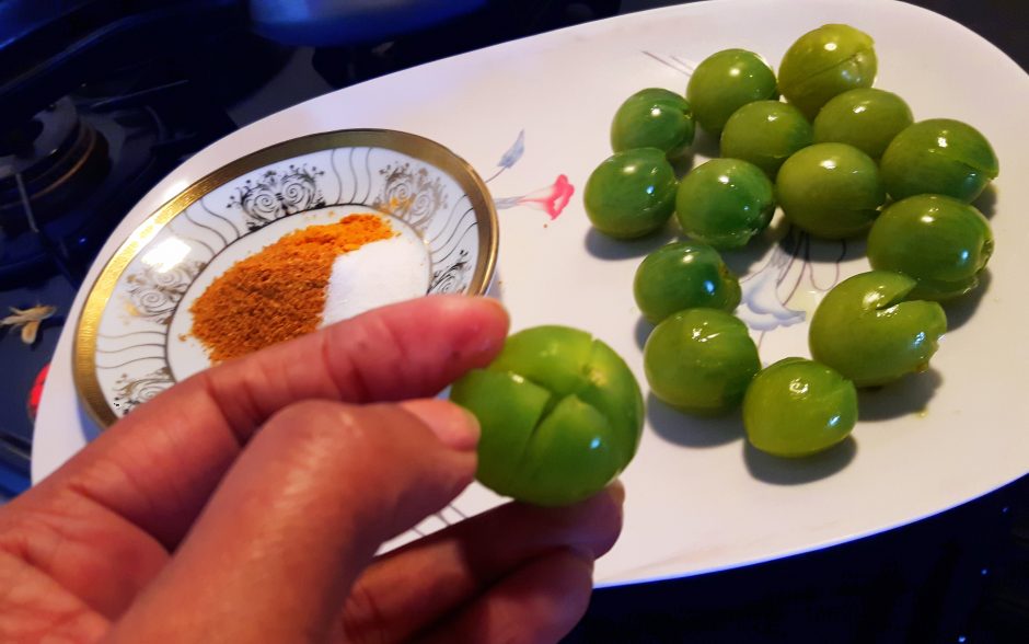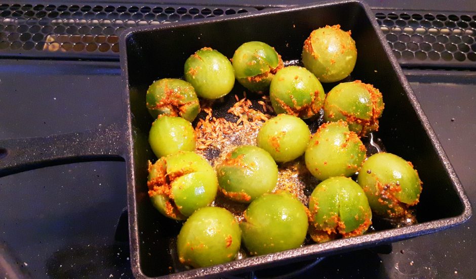 - “Stuffed Green tomato sabji (Kachche tamatar ki sabji)/ Bharwan green tomatoes” are ready to serve.