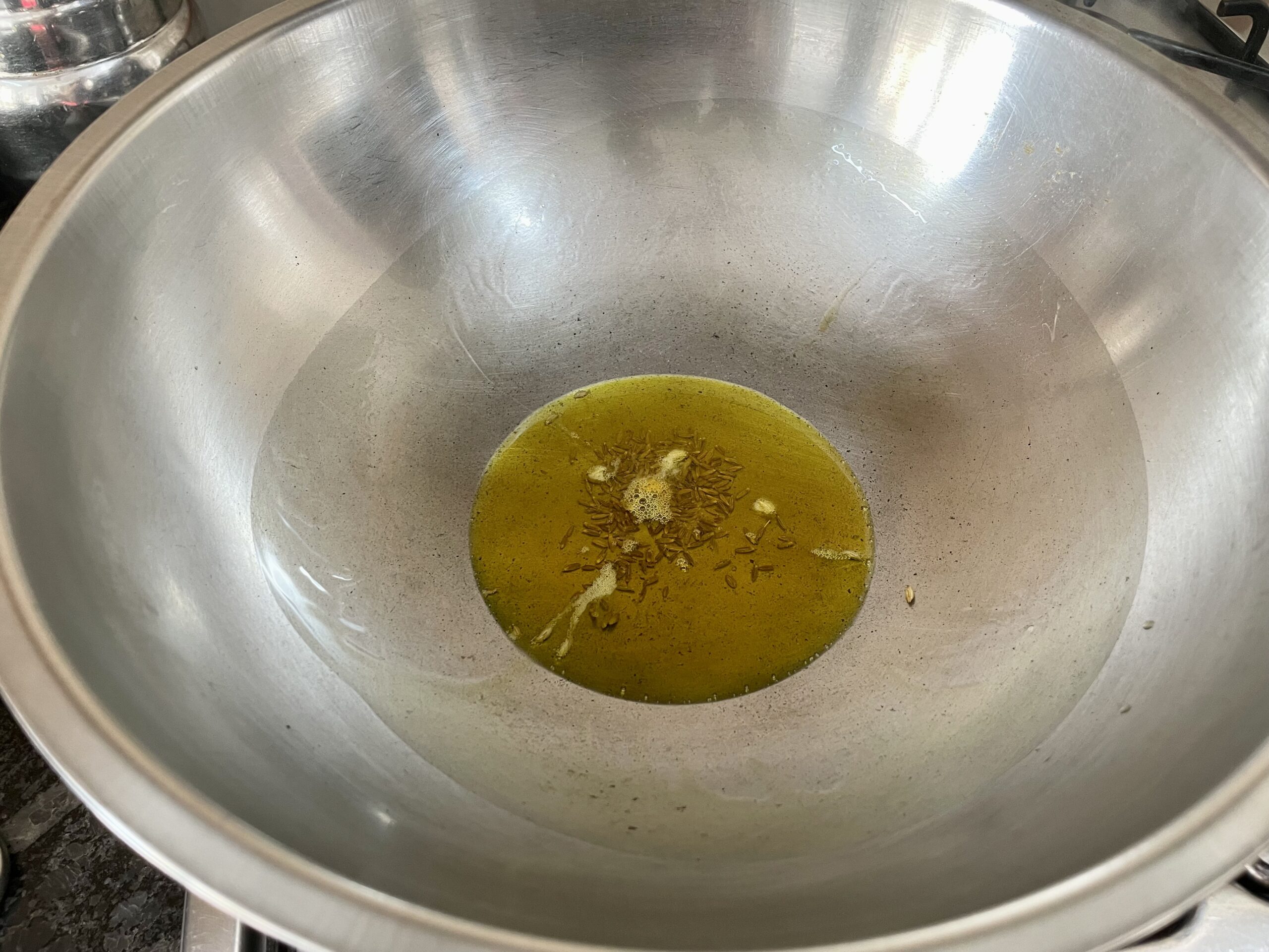 - Heat oil in a heavy bottom pan, when it starts to smoke add cumin; sputter for few seconds, add pinch of turmeric powder and chopped kundru, stir fry on medium flame.