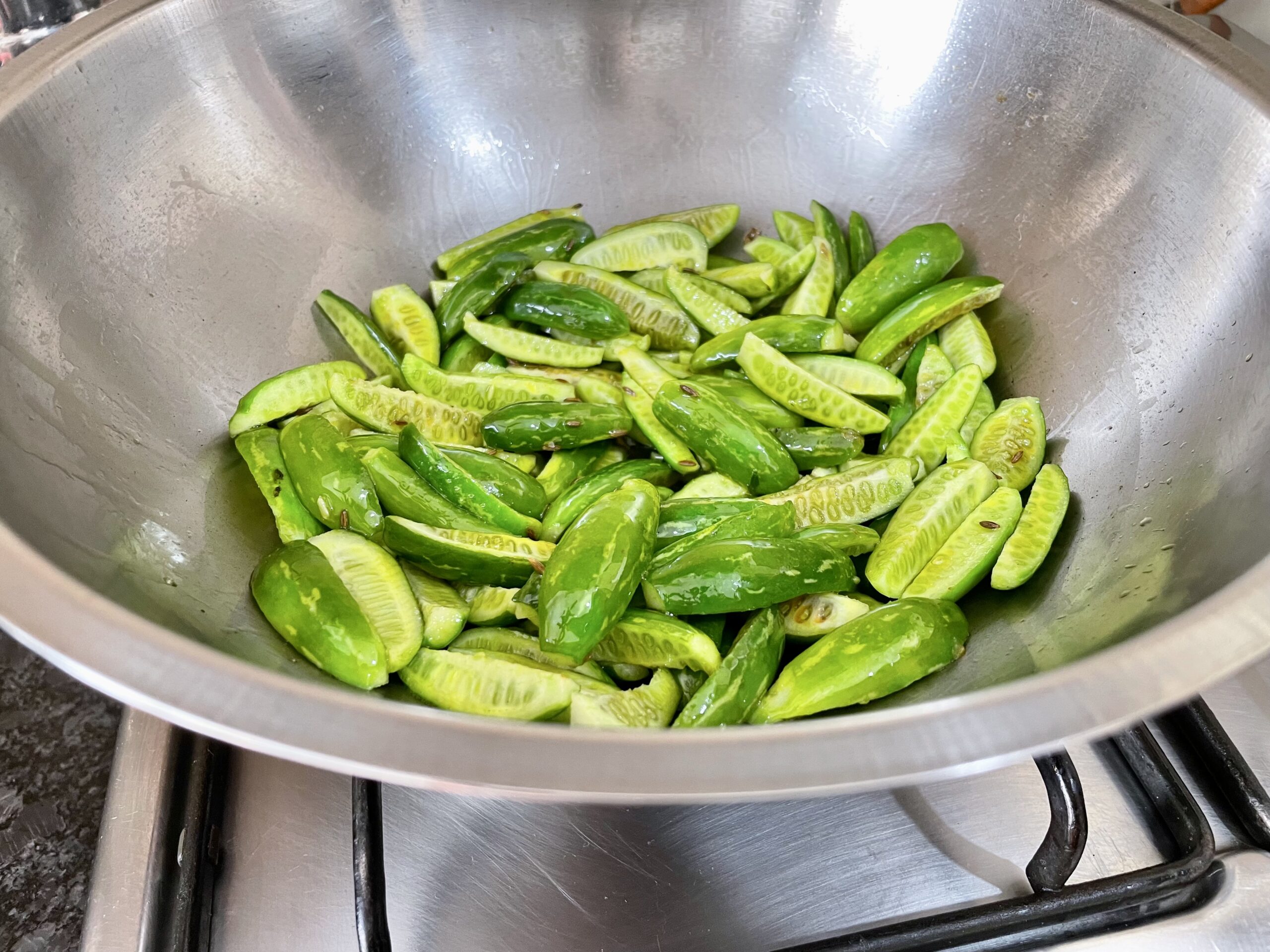 - Fry until kundru is half done with lid on (About 5-7 minutes); stir occasionally.