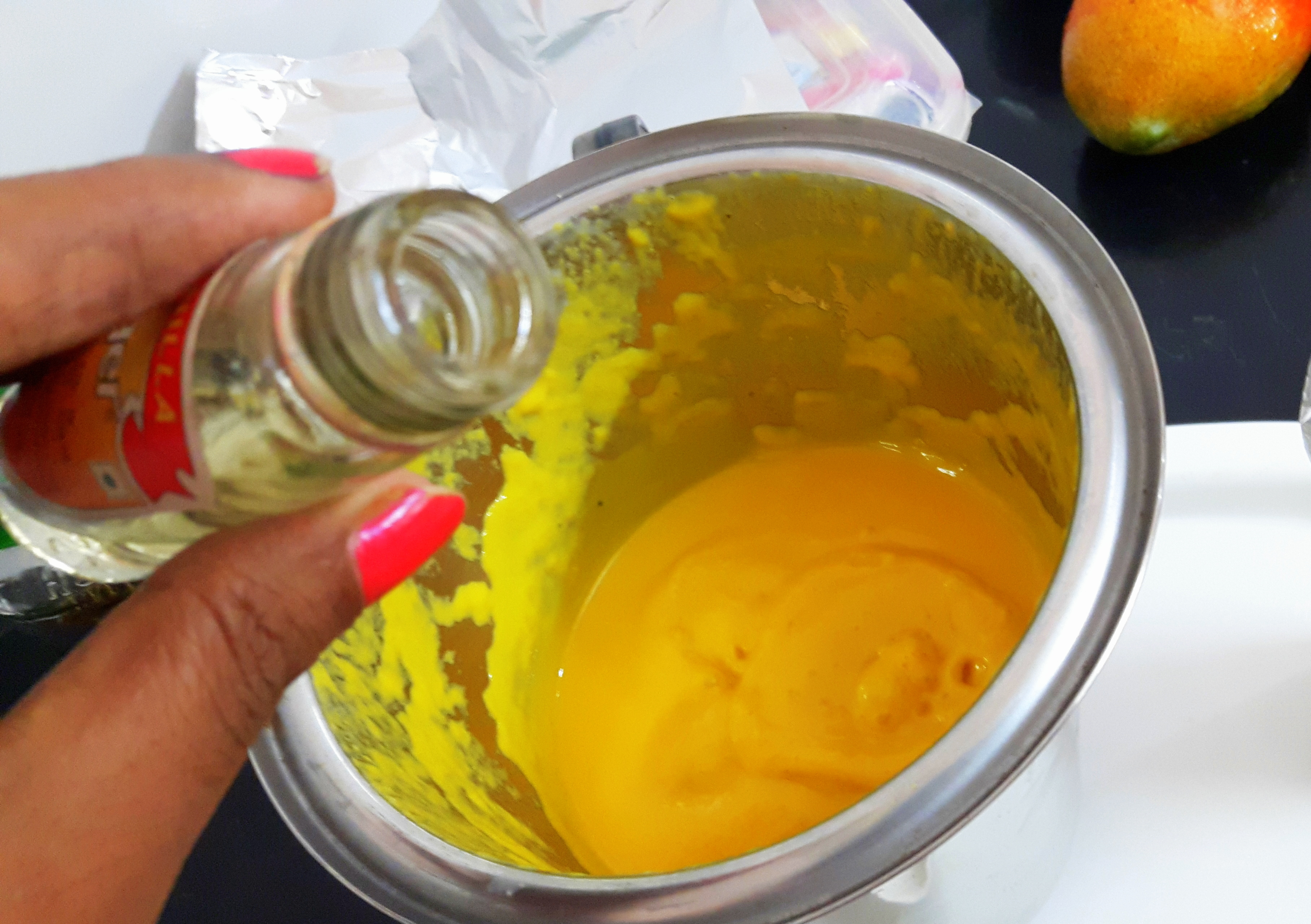 - Peel off mangoes, cut into pieces, discard seeds, and put the pulp in to blending jar, blend it till fine paste. Keep aside.