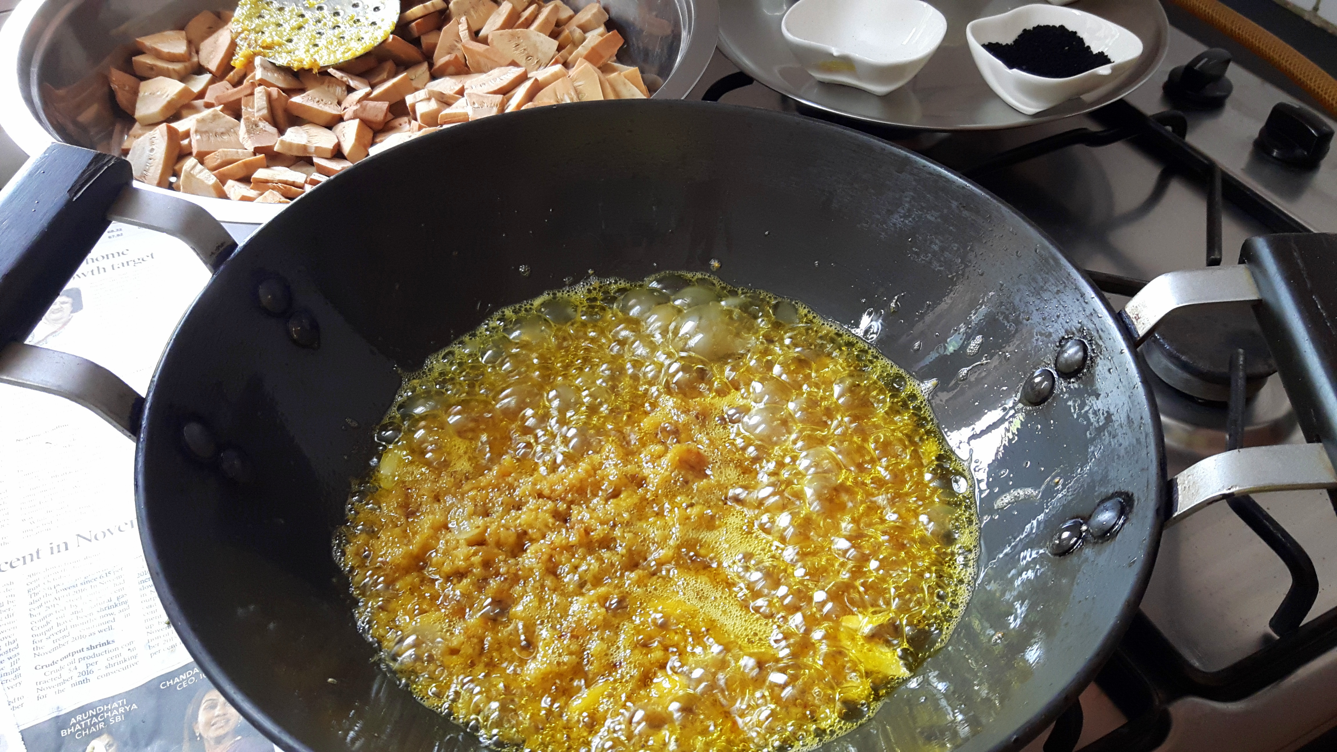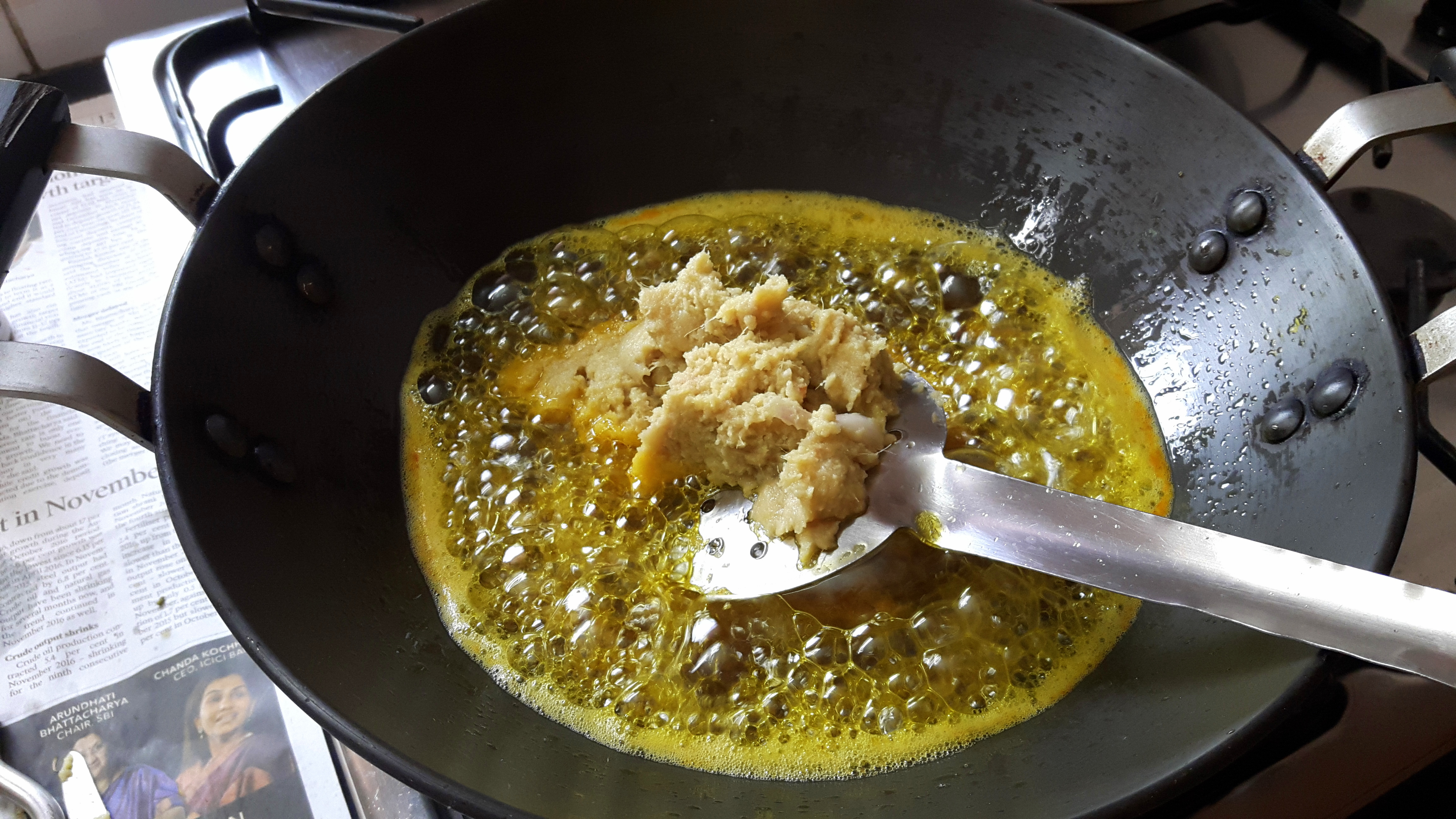 - Take a fry pan. Put oil in it, when oil starts smoking, put asafoetida and grounded wet masala.