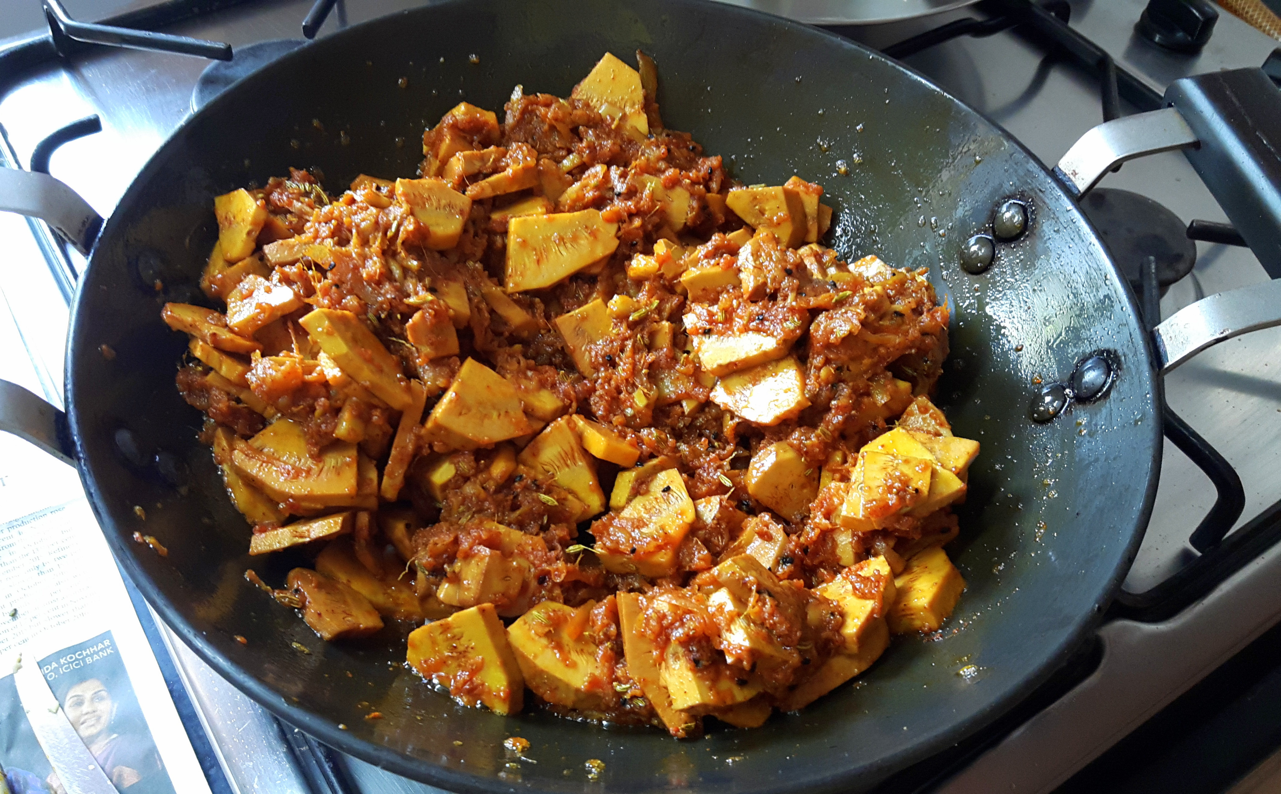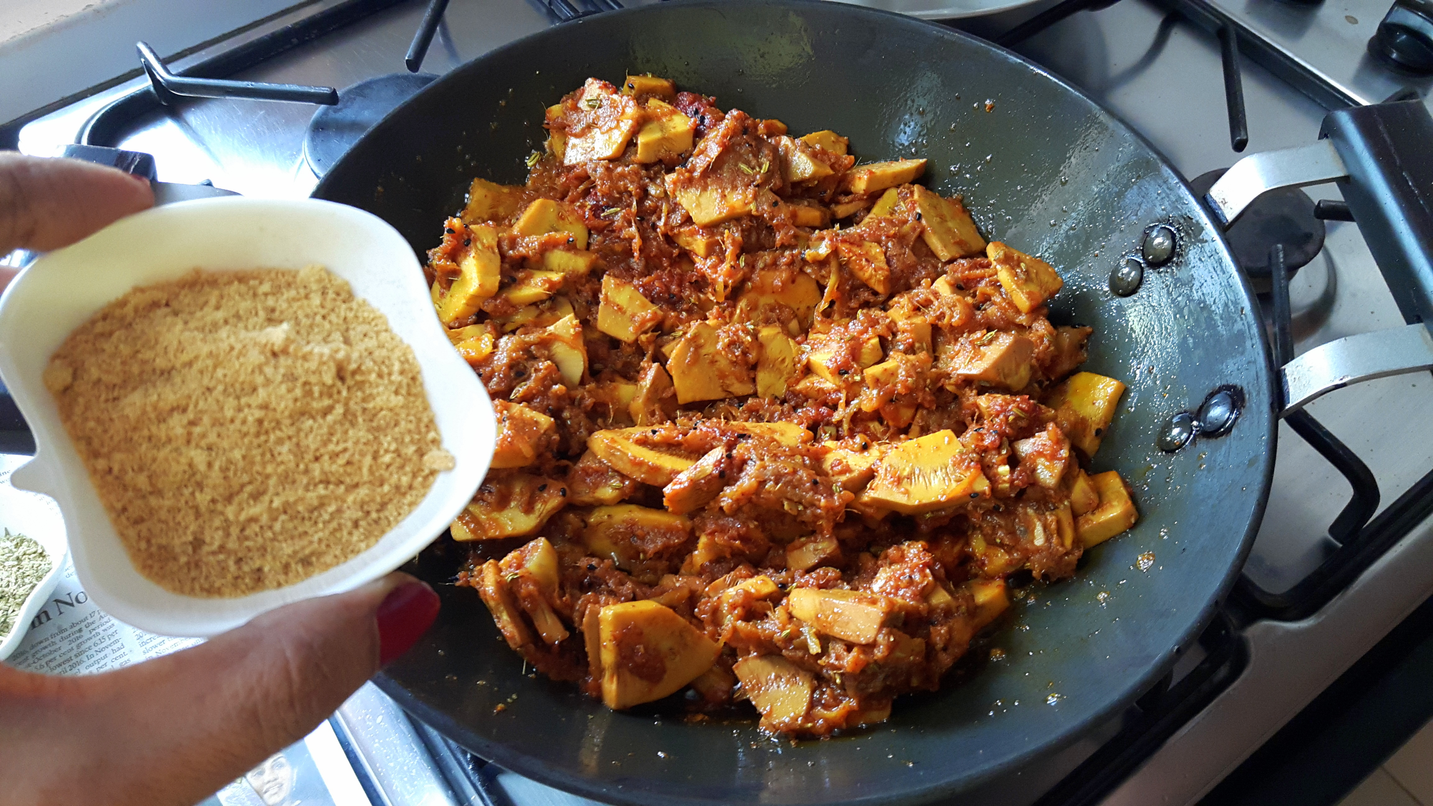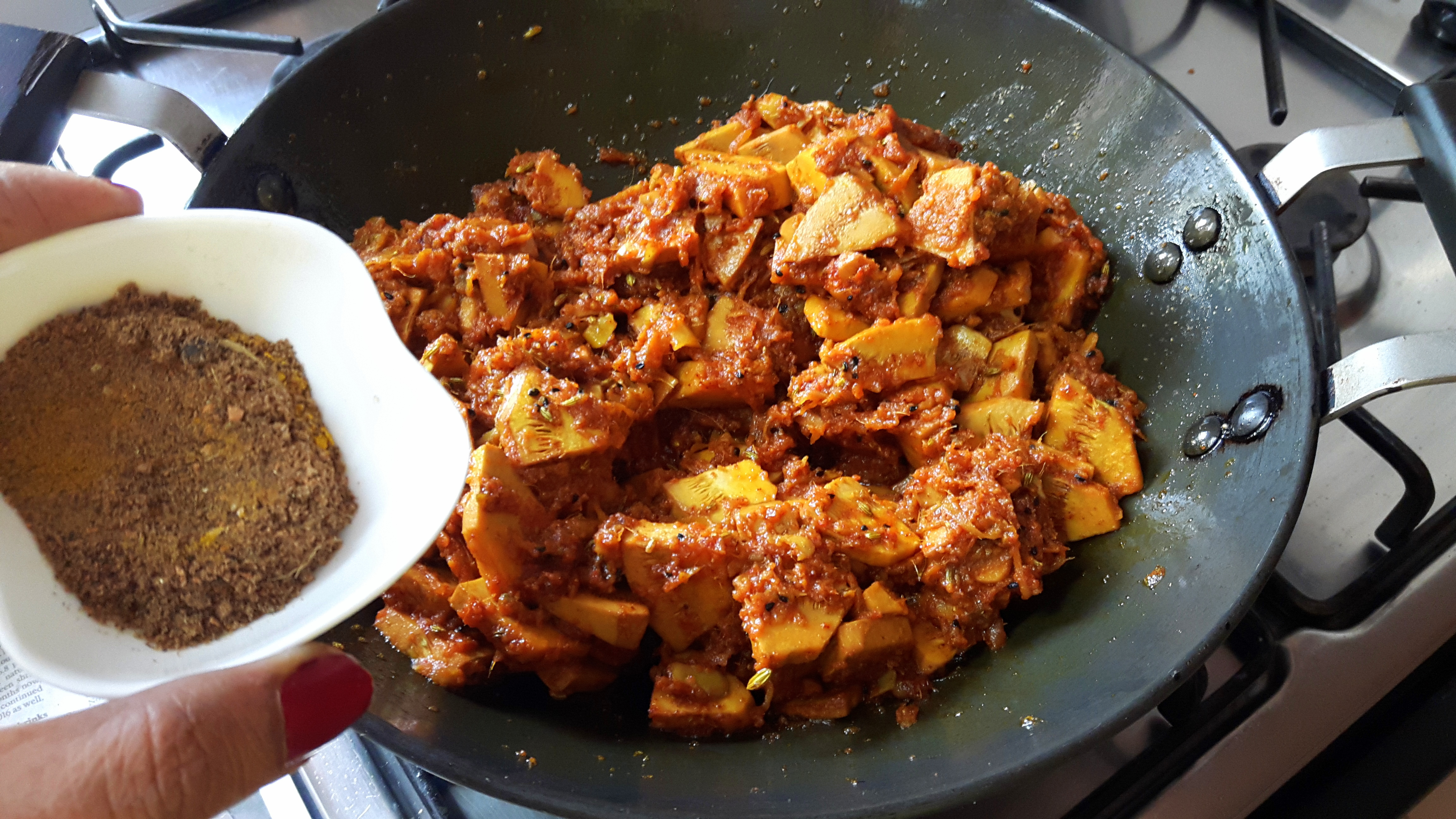 - Add raw grated mango stir fry for couple of minutes; add Salt, onion seed, Turmeric powder, Fennel seed, and Red chilli powder masala and raw jack fruit slice.