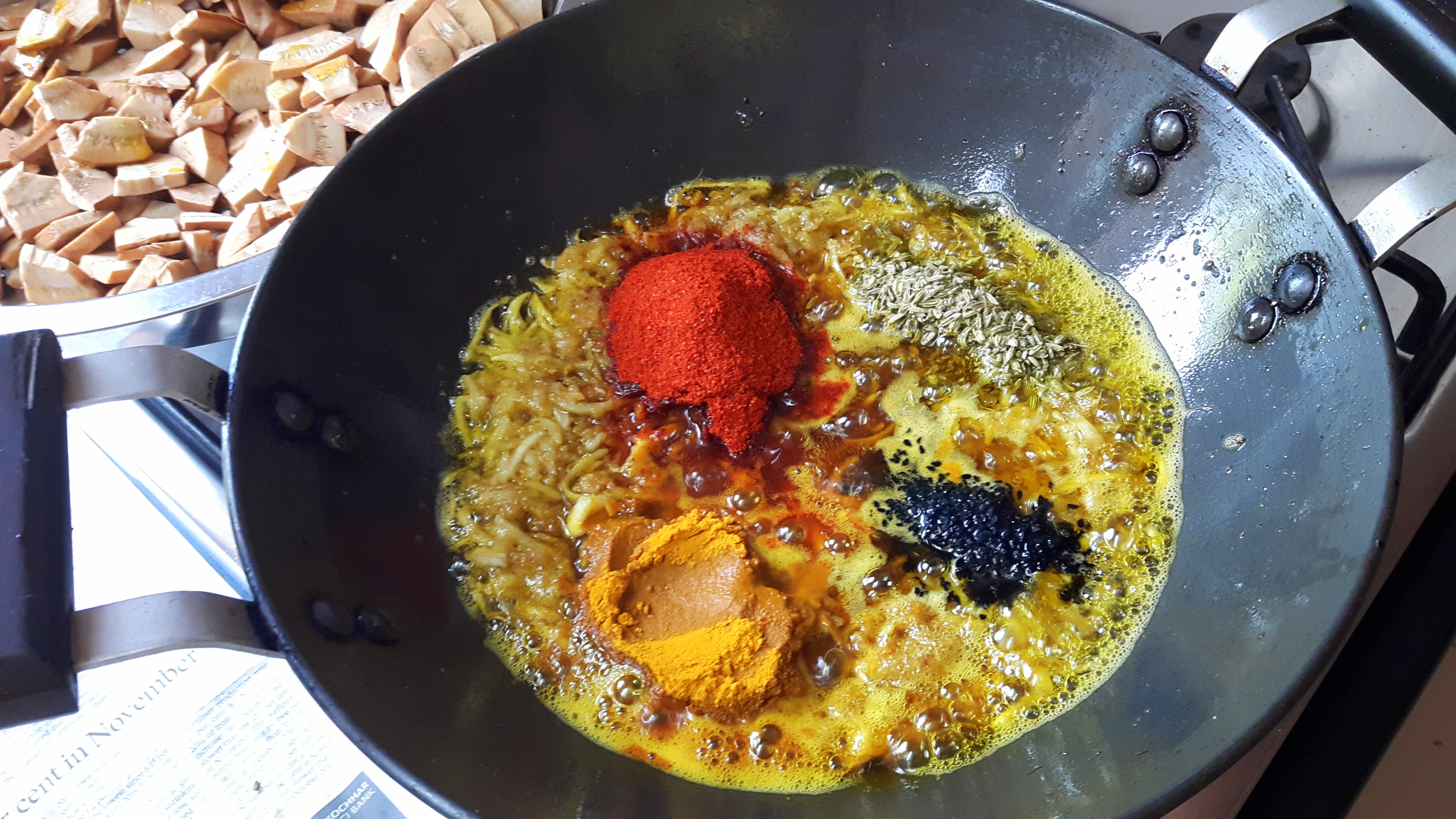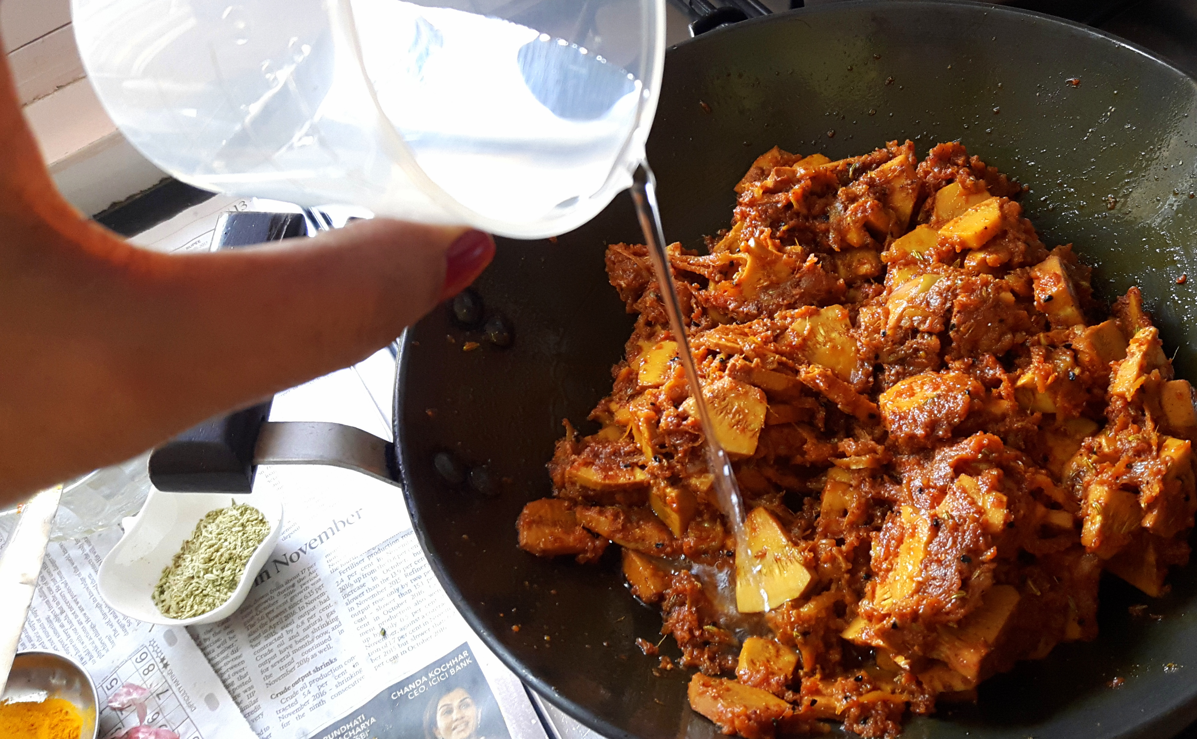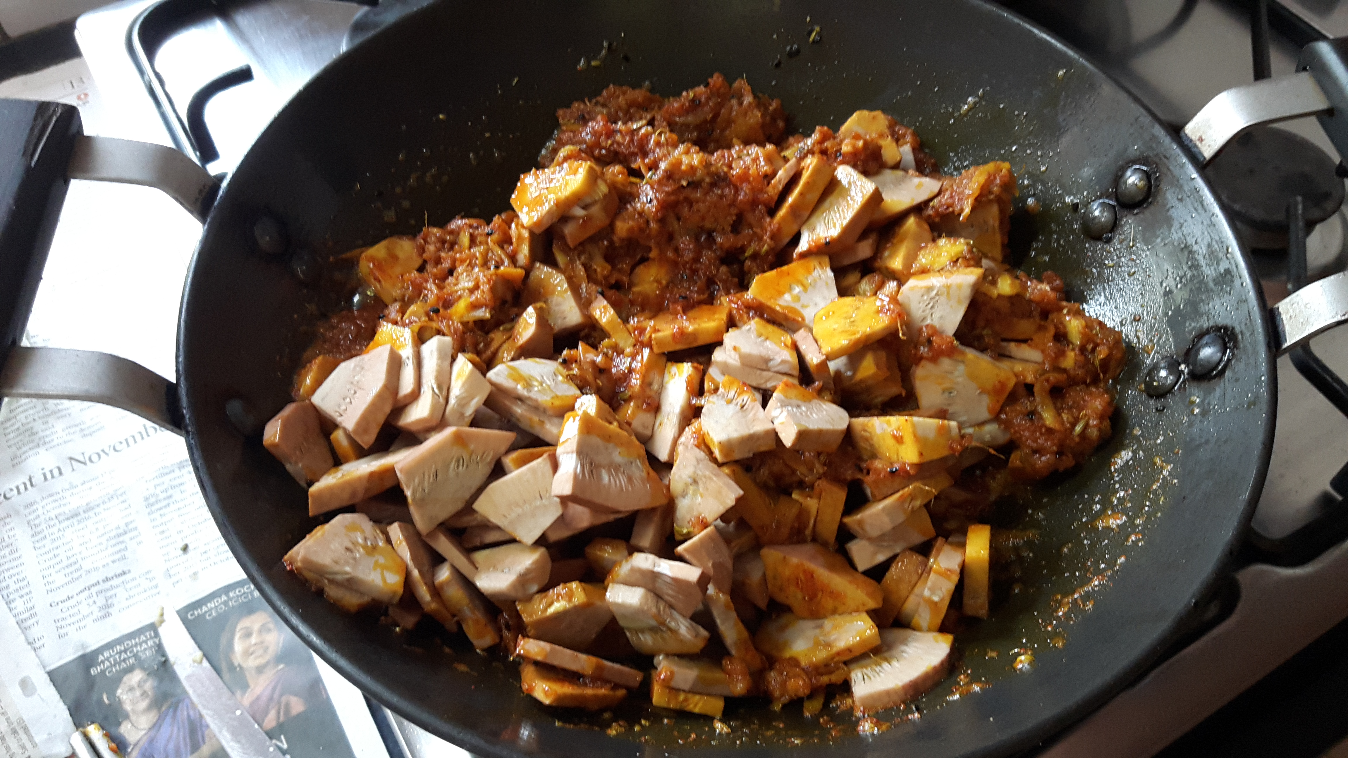 - Add raw grated mango stir fry for couple of minutes; add Salt, onion seed, Turmeric powder, Fennel seed, and Red chilli powder masala and raw jack fruit slice.