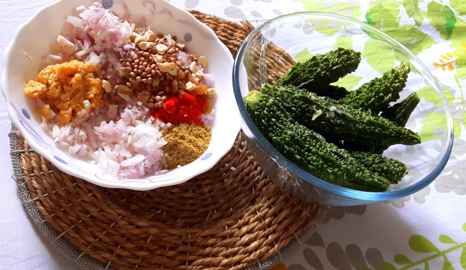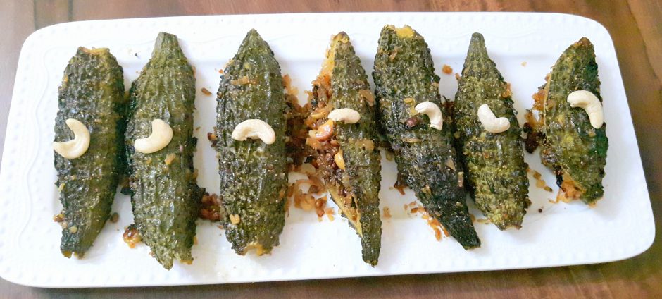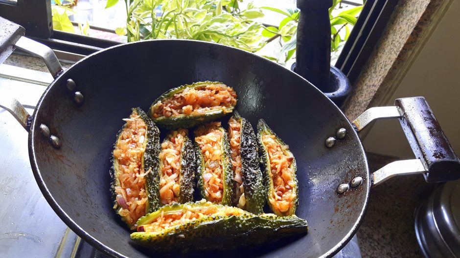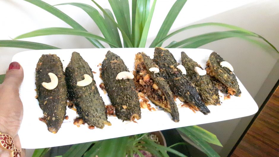 Are you fed up with same stuffed bitter gourd and would like to serve something special for your special guest; must go for this recipe ‘Royal stuffed bitter gourd’. I tasted this recipe at my daughter in law’s place .Her mother cooked the recipe that day and I ate it greedily, the taste of the recipe still stay with me.
