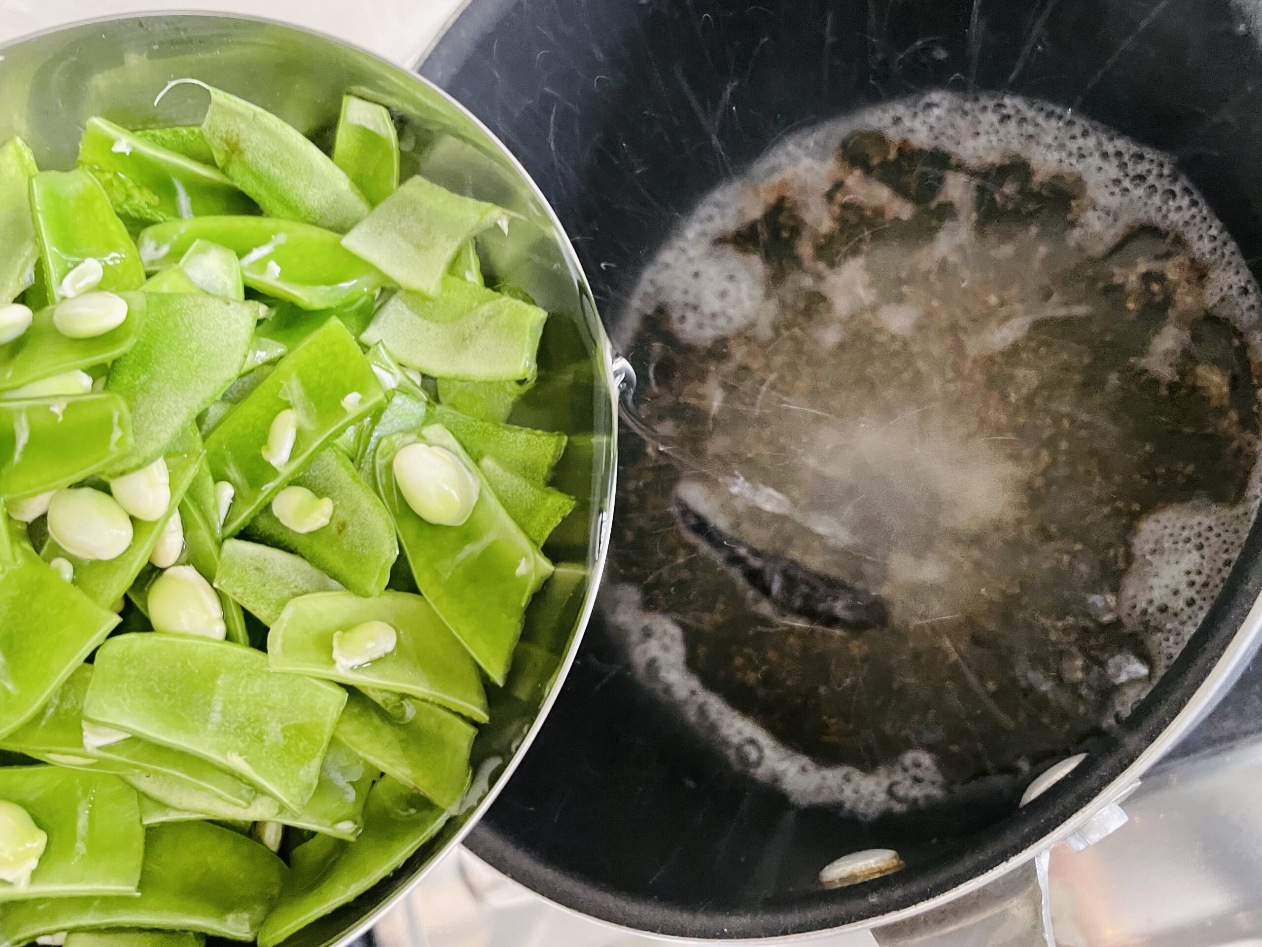 - Add suruti papadi and papadi beans; stir fry for couple of minutes on medium flame, add pinch of meetha soda (it preserve the green colour).