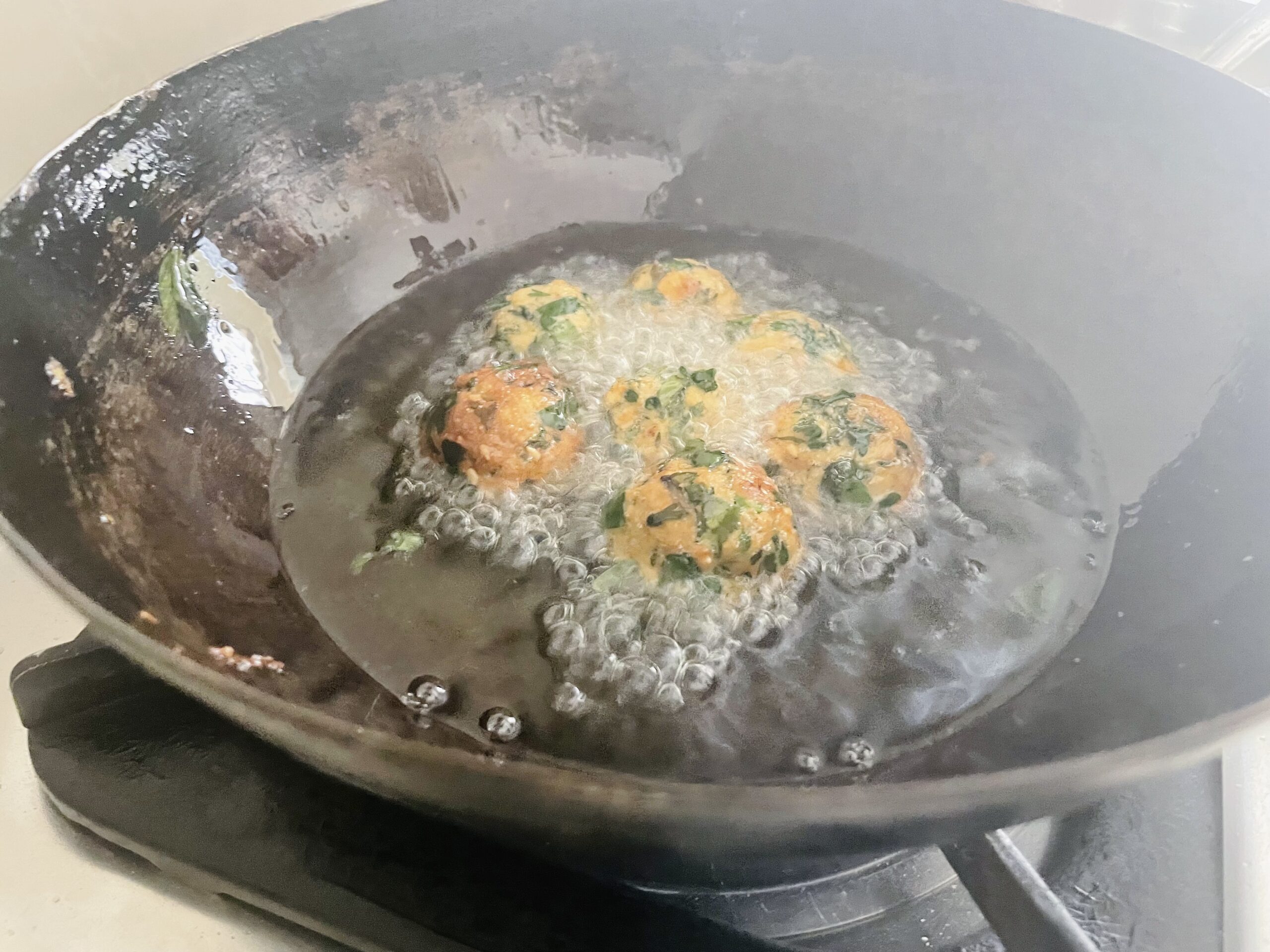- Heat oil in a heavy bottom frypan; let oil to smoke. Pour a bit of dough into the oil. If comes up, it means right temperature of oil otherwise wait for a while and test again.