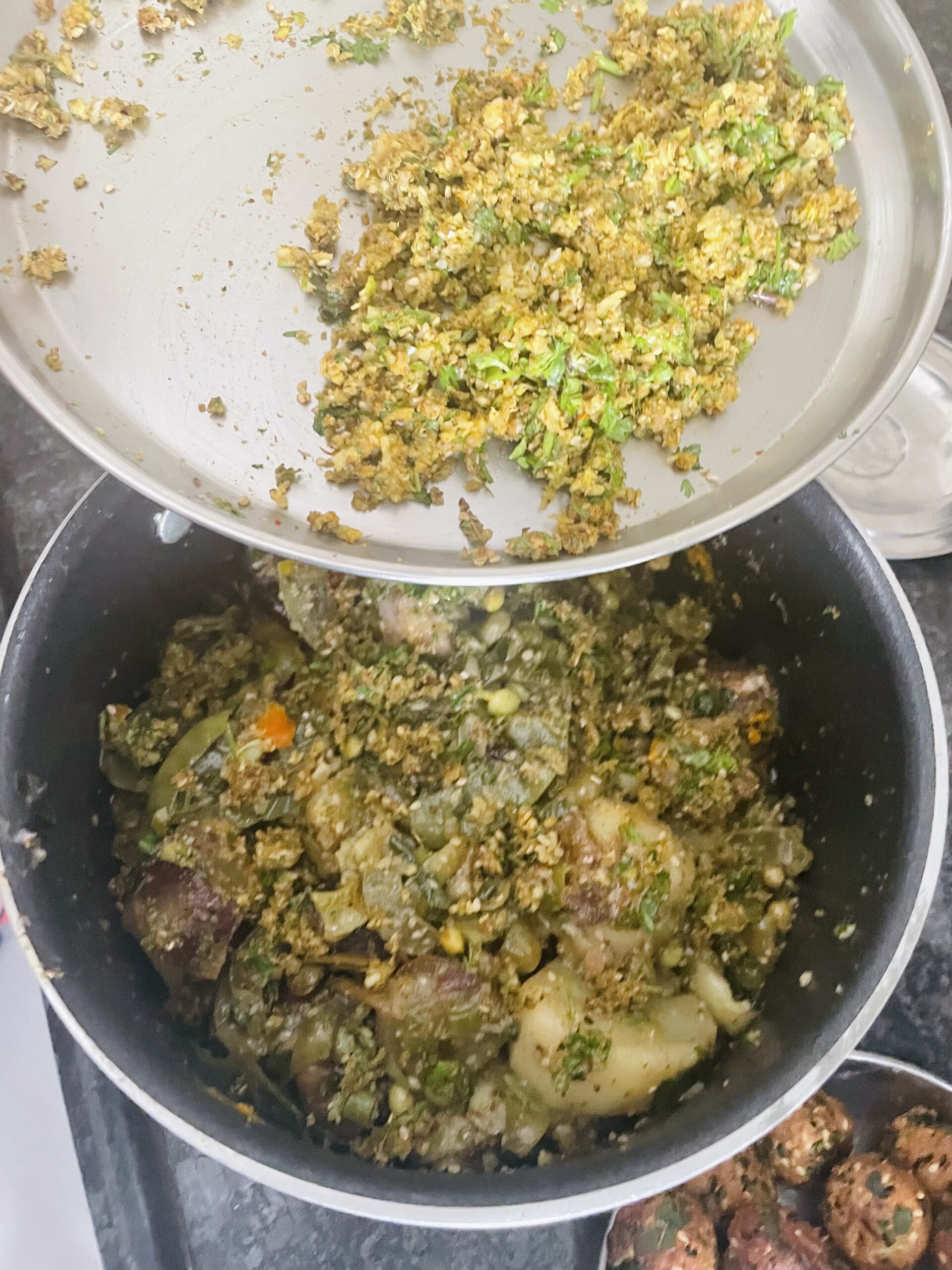 - Lower the flame; add a layer of (left out) stuffing, add toovar dana, peas and a layer of purple yam and raw banana, continue to cook on medium flame for 3-4 minutes with lid on.