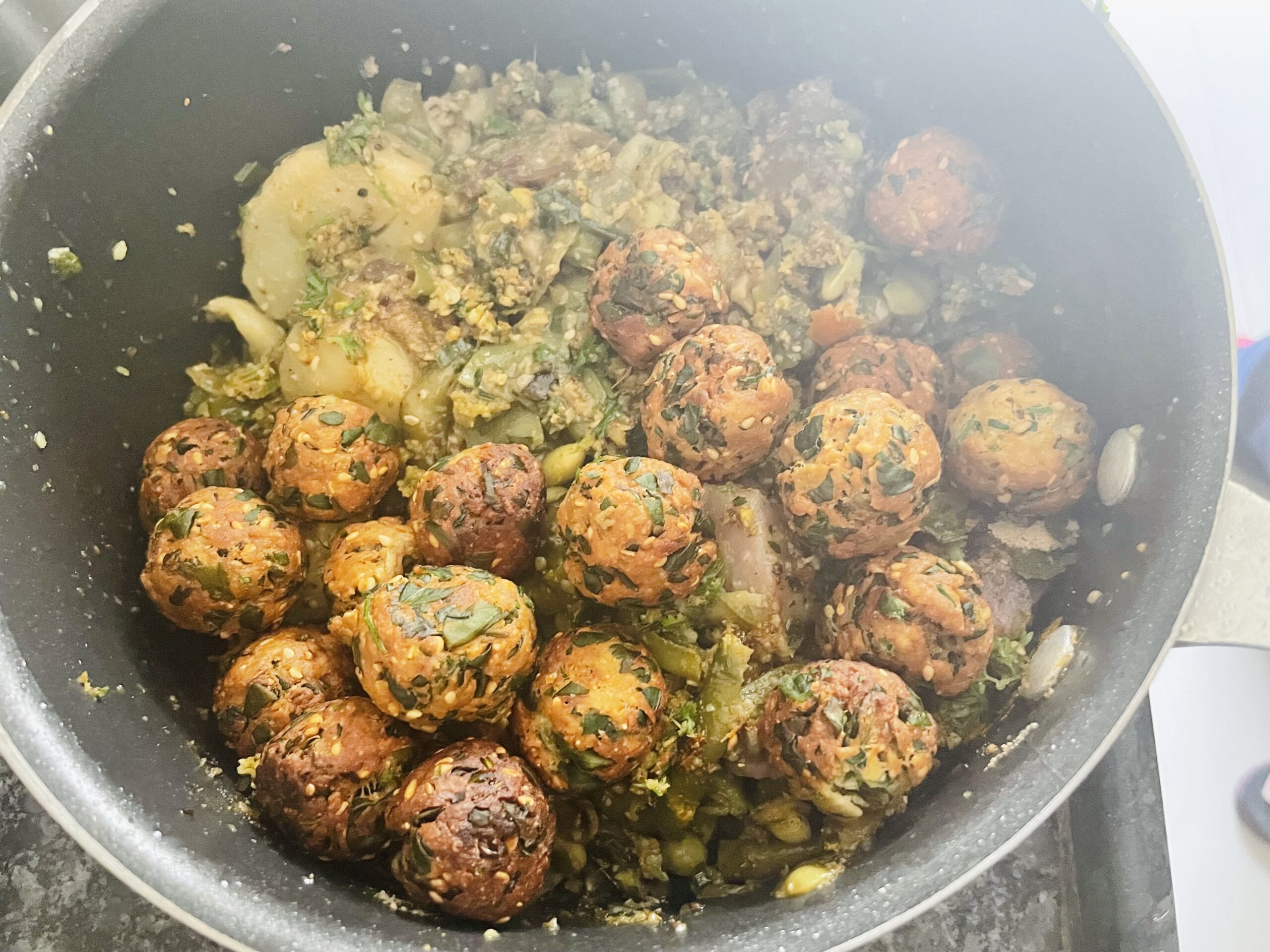 - Open the cooker; gentely mix everything, without breaking the muthiya and stuffed vegetables.